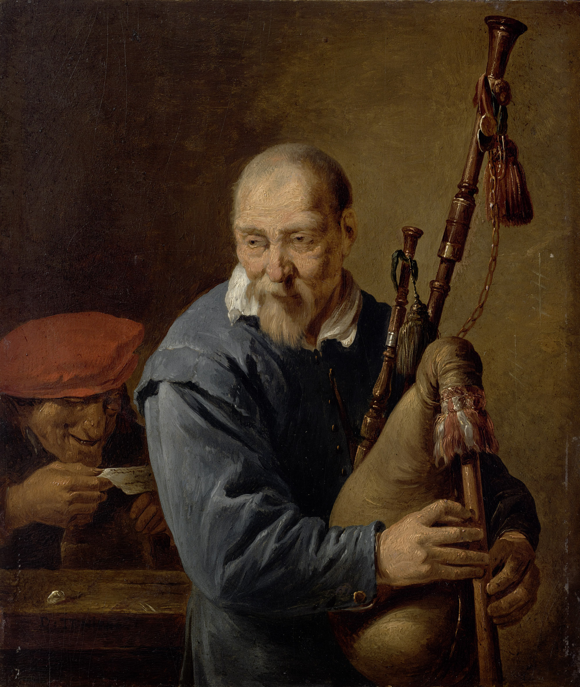 A light source from the left illuminates the face, right side and bagpipes of the musician who has paused for a minute in the centre of the picture. The mouthpiece of the instrument is unused. There is a striking change from the rougher brushwork in his face to the fine painting where the chanter emerges from the airbag. The red cap of the peasant peering at a piece of paper in the shadowy half of the picture forms a pleasing contrast to the bagpiper’s blue coat.