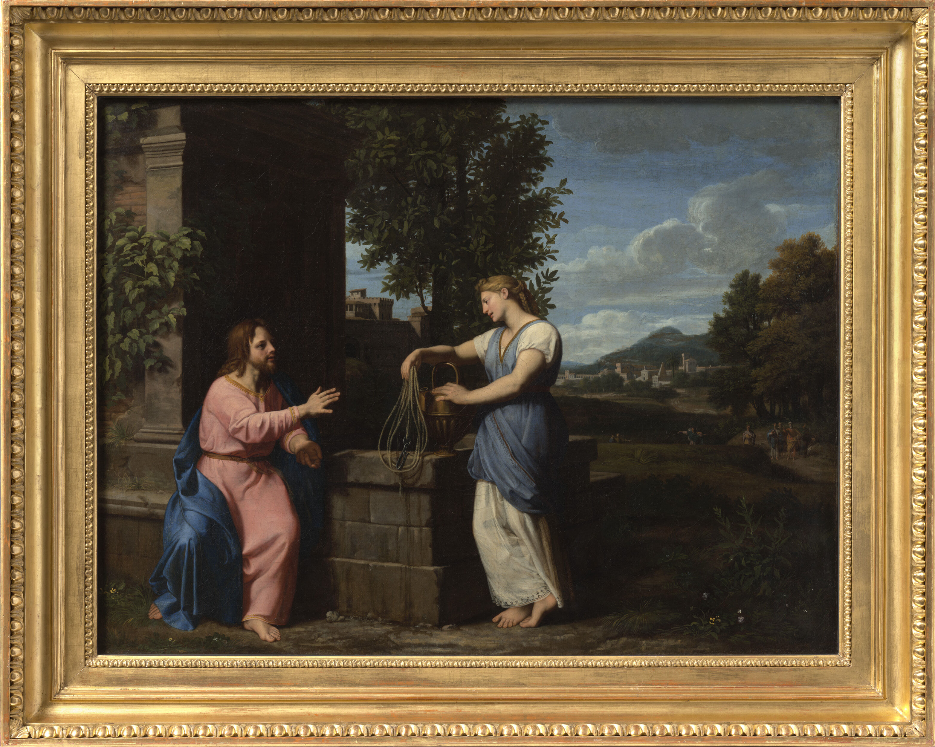 This inner peace accords with the artistic rendering of the subject: the Samaritan woman listening with rapt attention to the words of Christ (John 4, 4–42). Leaning against the well, holding a rope and with her right hand on the bucket, she bows her head towards the Son of God, who asks her for a drink and tells her of the water of life. In the distance between them we can see the temple of the Samaritans, to the right the city of Sychar and the approaching disciples.