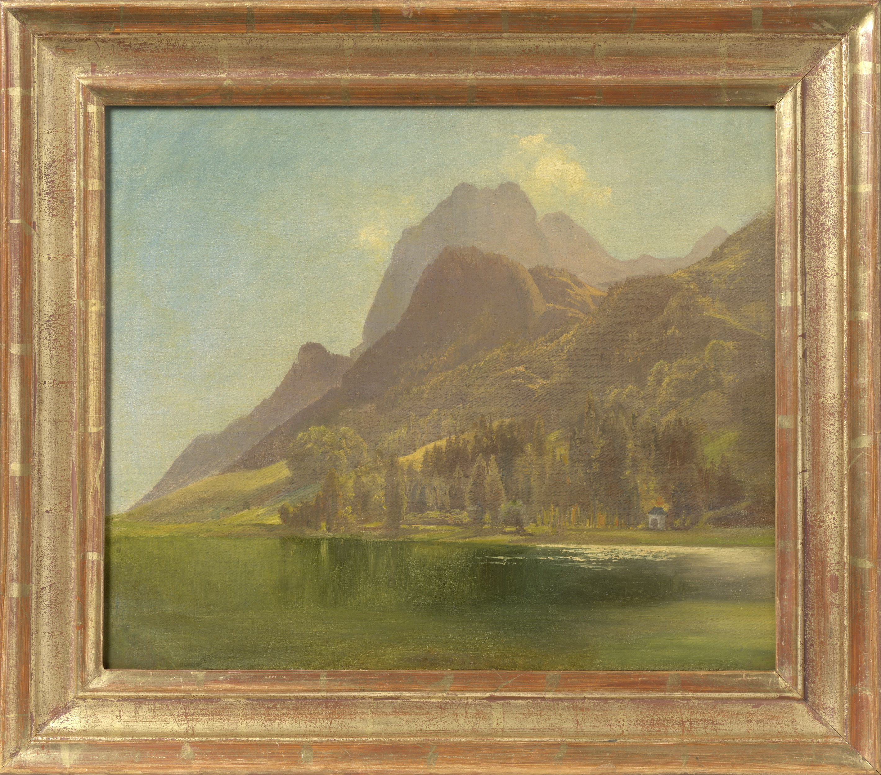 Here Hansch shows "St Anthony’s Chapel" on the western bank of the lake, recognisable by its hipped roof and round-arched portal. Surrounded by woods and meadows, it is the sole indication of human existence against the background of the majestic mountains. Rising behind the Halsalm and the Teufelskopf is the Mühlsturzhorn, part of the Reiter Alm. Immediately in front of the chapel, delicate yellow waves in the otherwise greenish lake water reflect the flames on the roof and in the surrounding woods.