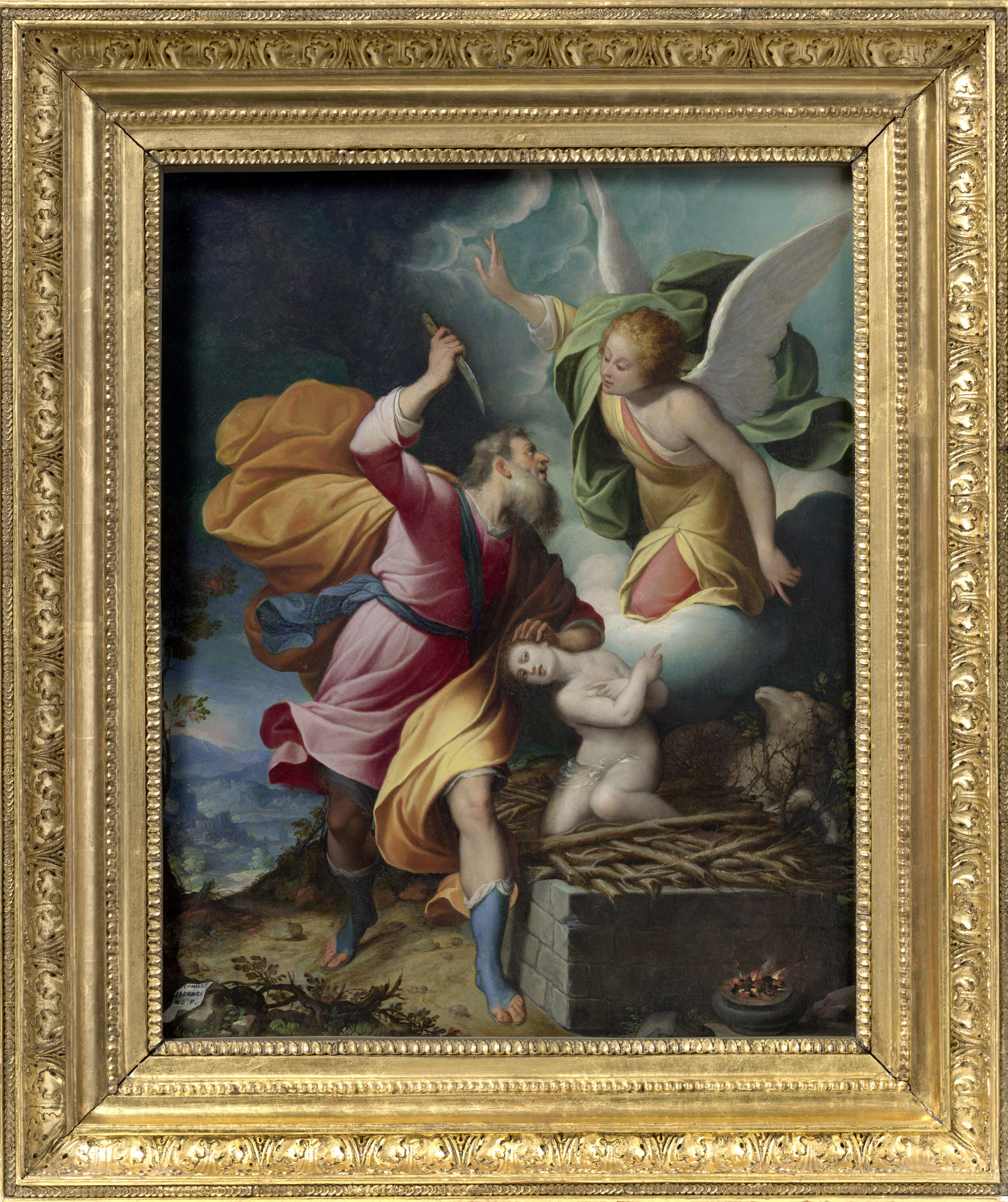 Until the end of the 16th century, Procaccini’s work showed mannerist influences, then he changed his style to baroque. The "Sacrifice of Isaac" (Gen 22) may be placed in his late mannerist period, around 1600. The moment of sacrifice is painted with precision; Abraham turning his body, the angel’s expansive gesture to stay his hand and the colour values of the clothes all bespeak the artist’s mannerist training. Abraham raises the knife to strike, his son bows his head in submission. On the right, behind the sacrificial altar, the ram which will ultimately die instead of Isaac has entangled its horns in a hedge. Procaccini’s rendering follows the biblical text fairly closely. He painted several versions of the same story, but none of these has the fine painterly quality of the Salzburg picture.