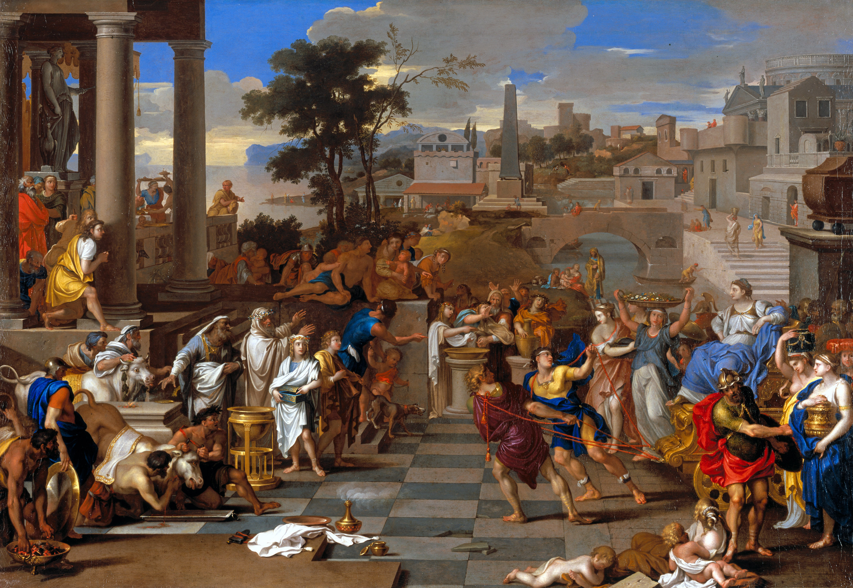 Loir sets the story in an imaginative classical urban landscape. The elaborate composition is based on Poussin’s rational perception of art. The three protagonists are joyously acclaimed by people and priests, as though on a stage. Clarity and accents of colour define the multitude in the foreground against the grey background of the cubic townscape. The artist made a second, reversed painting on the subject with a slightly altered composition (Budapest, Szépmüvészeti Muzeum, Collection Esterházy, inv. no. 698) and a reversed print (Paris, Bibliothèque Nationale, Cabinet des estampes, Da 42 folio) with exactly the same arrangement as the Salzburg painting.