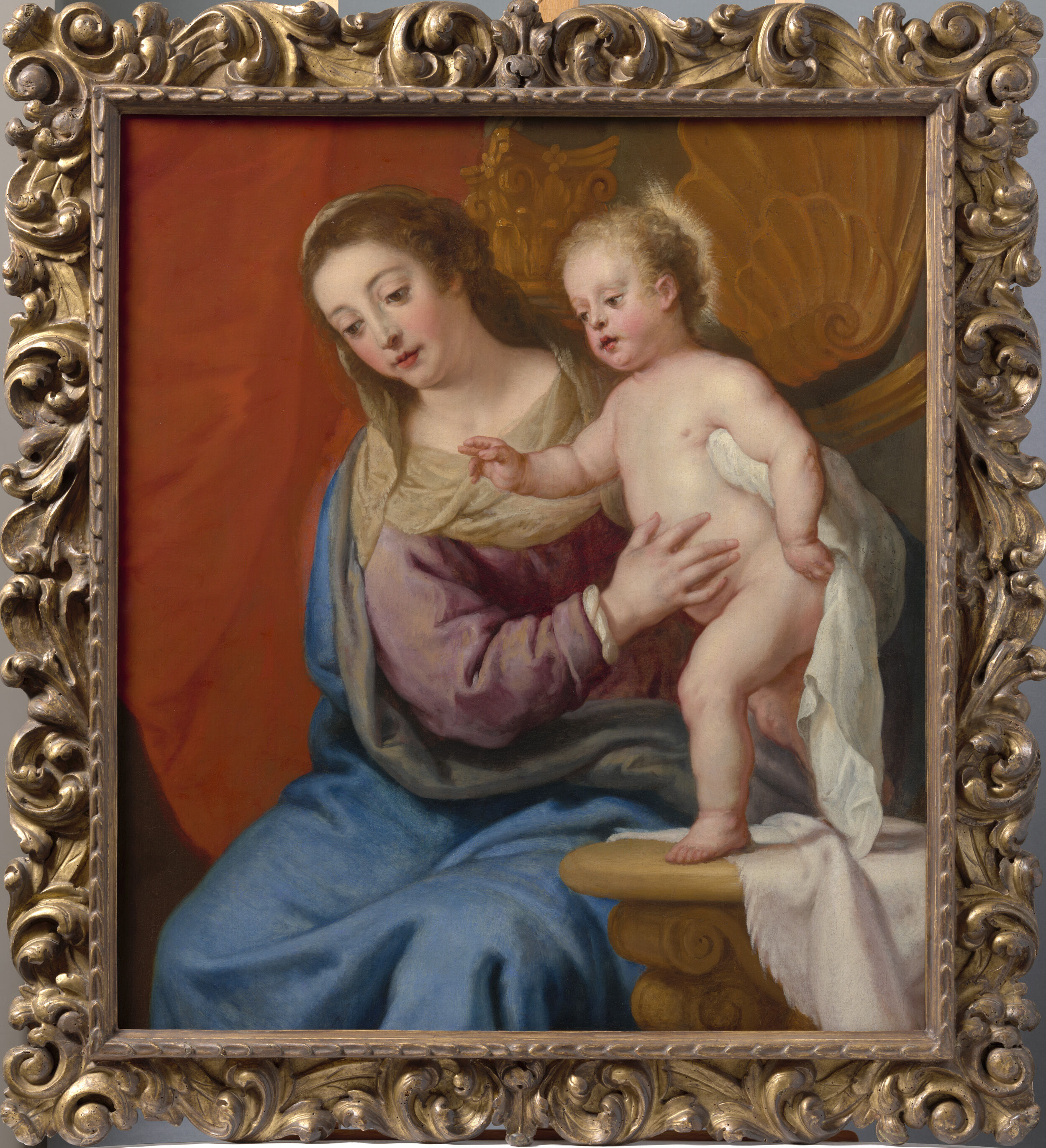 Crayer drew inspiration from Schelte Bolswert’s engraving of Rubens’ lost painting "PVTEVS AQVARVM VIVENTIVM. Fonteyn der houen" (Virgin and Child by a fountain). Mary was originally shown full-length. A caryatid (a female figure supporting an entablature) supported the arm of the chair, from which a patterned carpet extended into the room. A red curtain surrounded the richly decorated chair, below which Crayer defined the background by means of an architectural element, the edge of a wooden