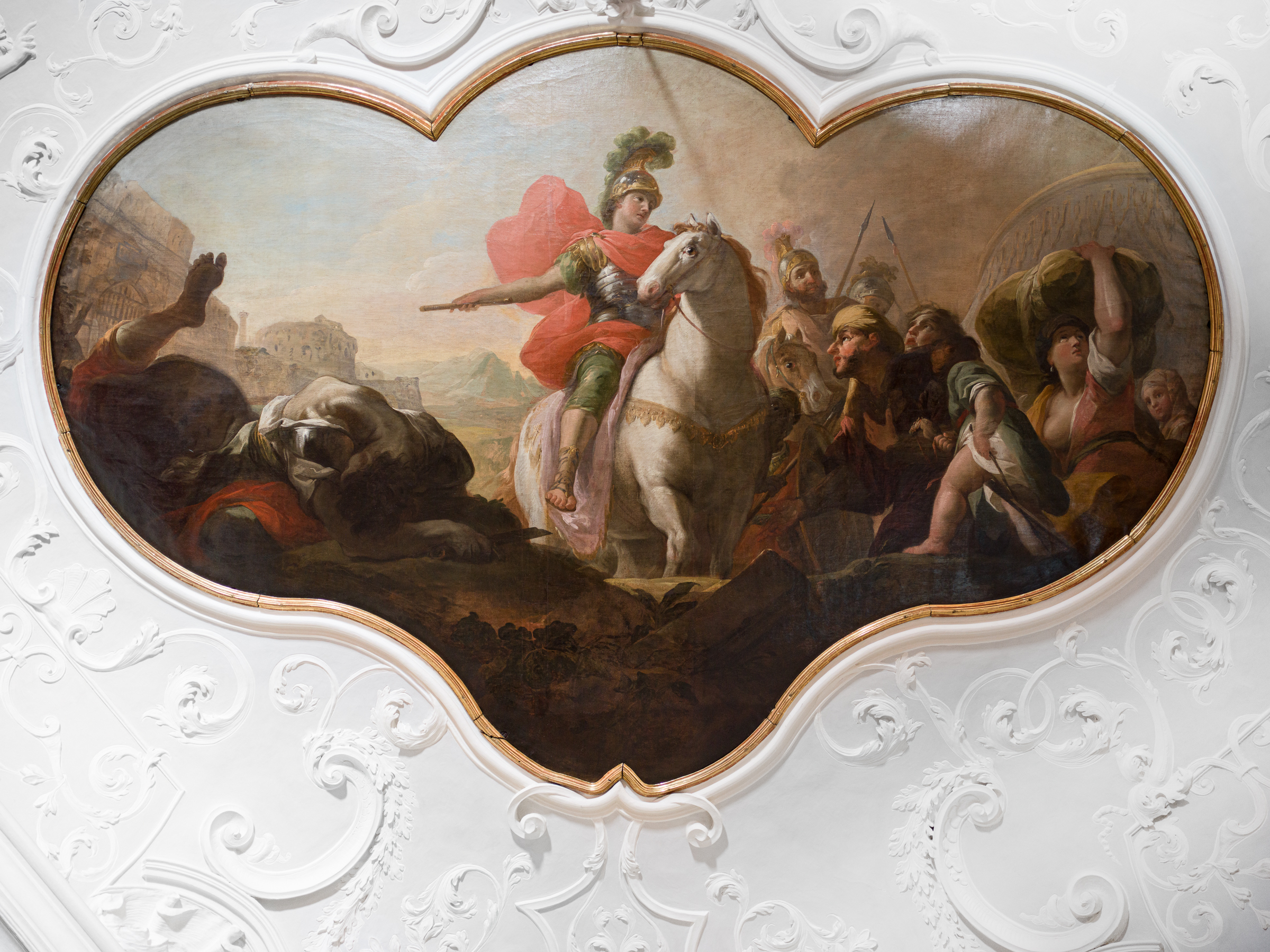 The ceiling painting was done in 1711 by Martino Altomonte, who had trained in Italy. It shows the young Alexander the Great mounted on his horse, wearing armour, helmet and a red cloak, and accompanied by foot-soldiers. He points his general’s baton towards a town in the background, a stronghold which he conquered and re-founded as Alexandropolis. This was the first conquest of his campaign.