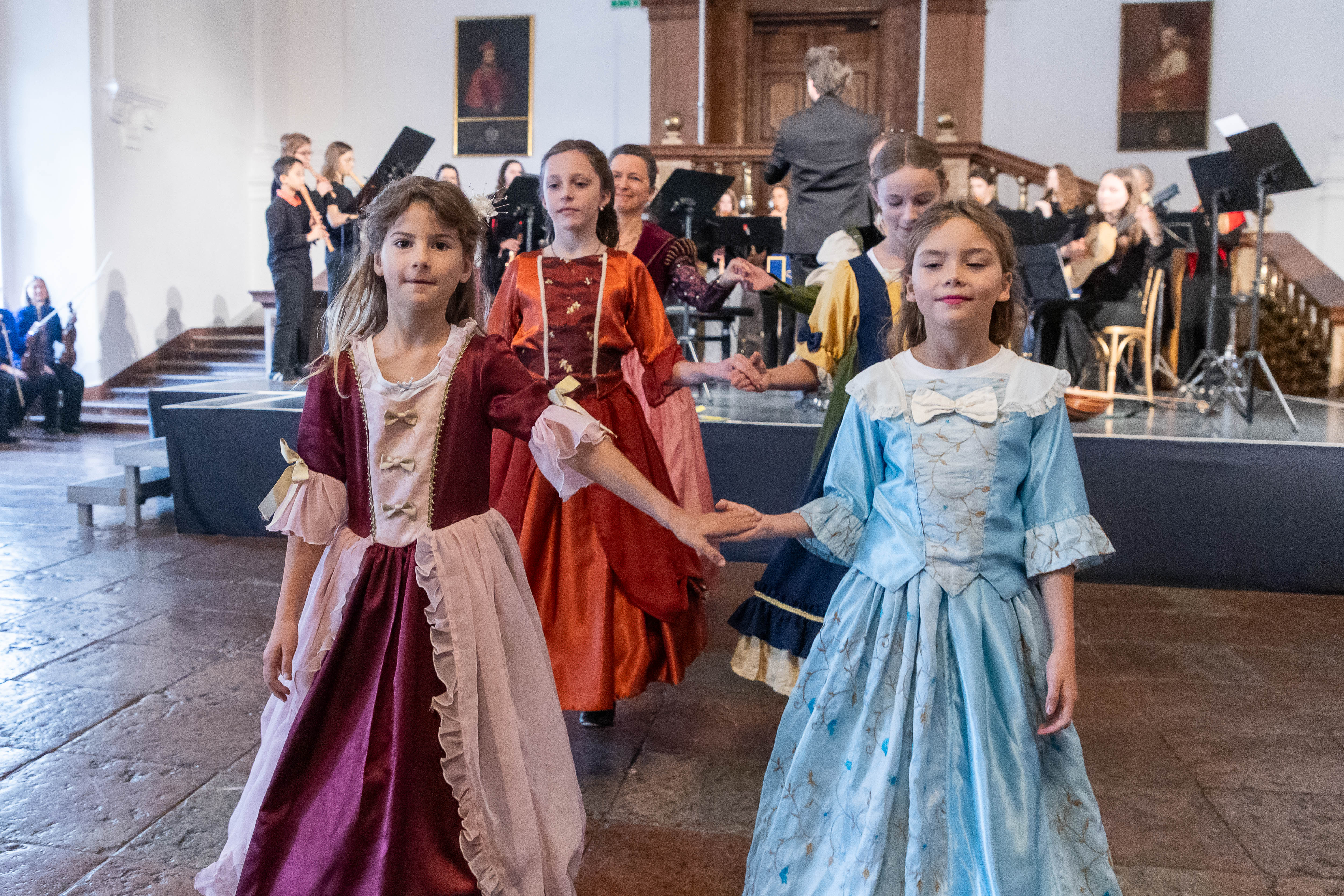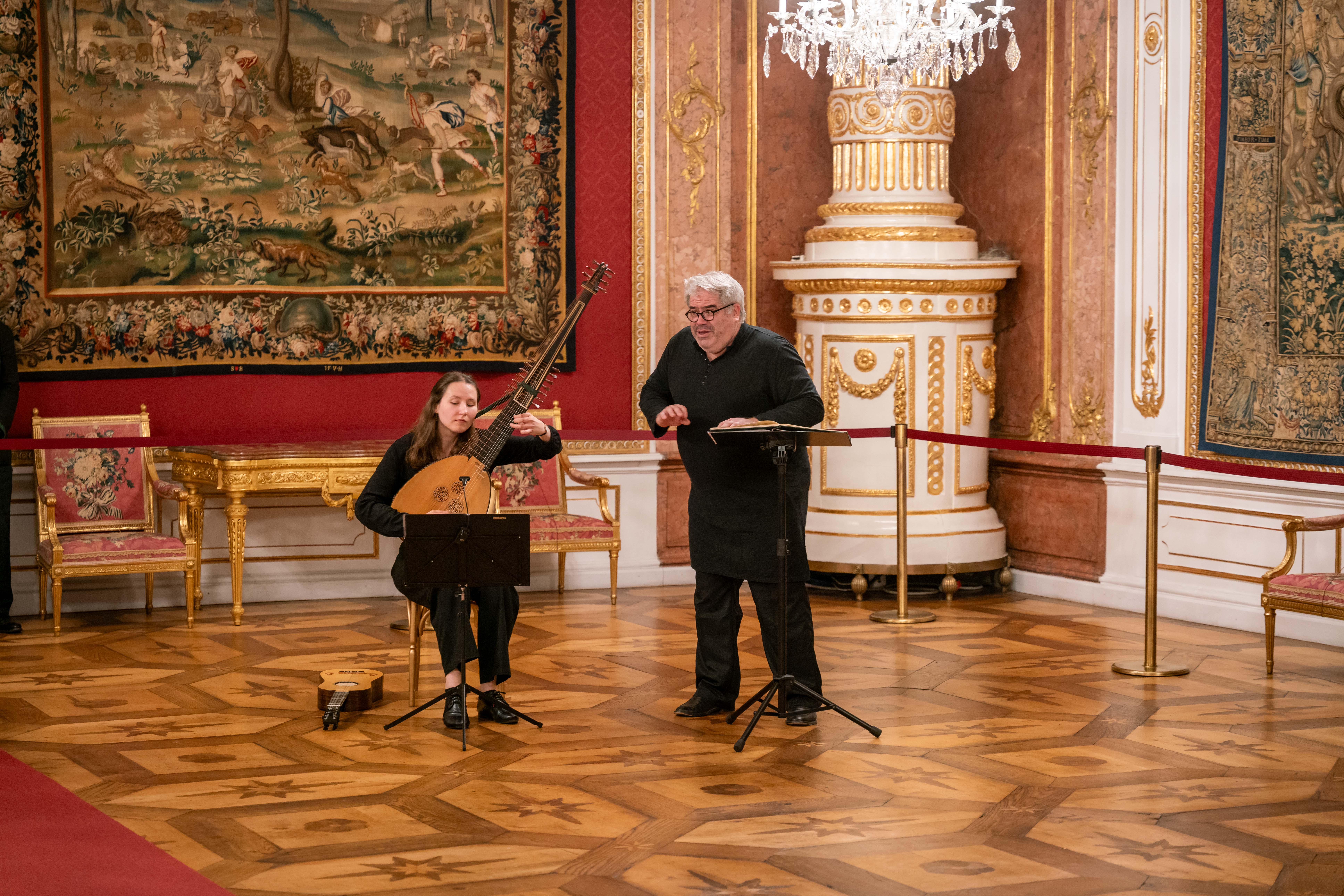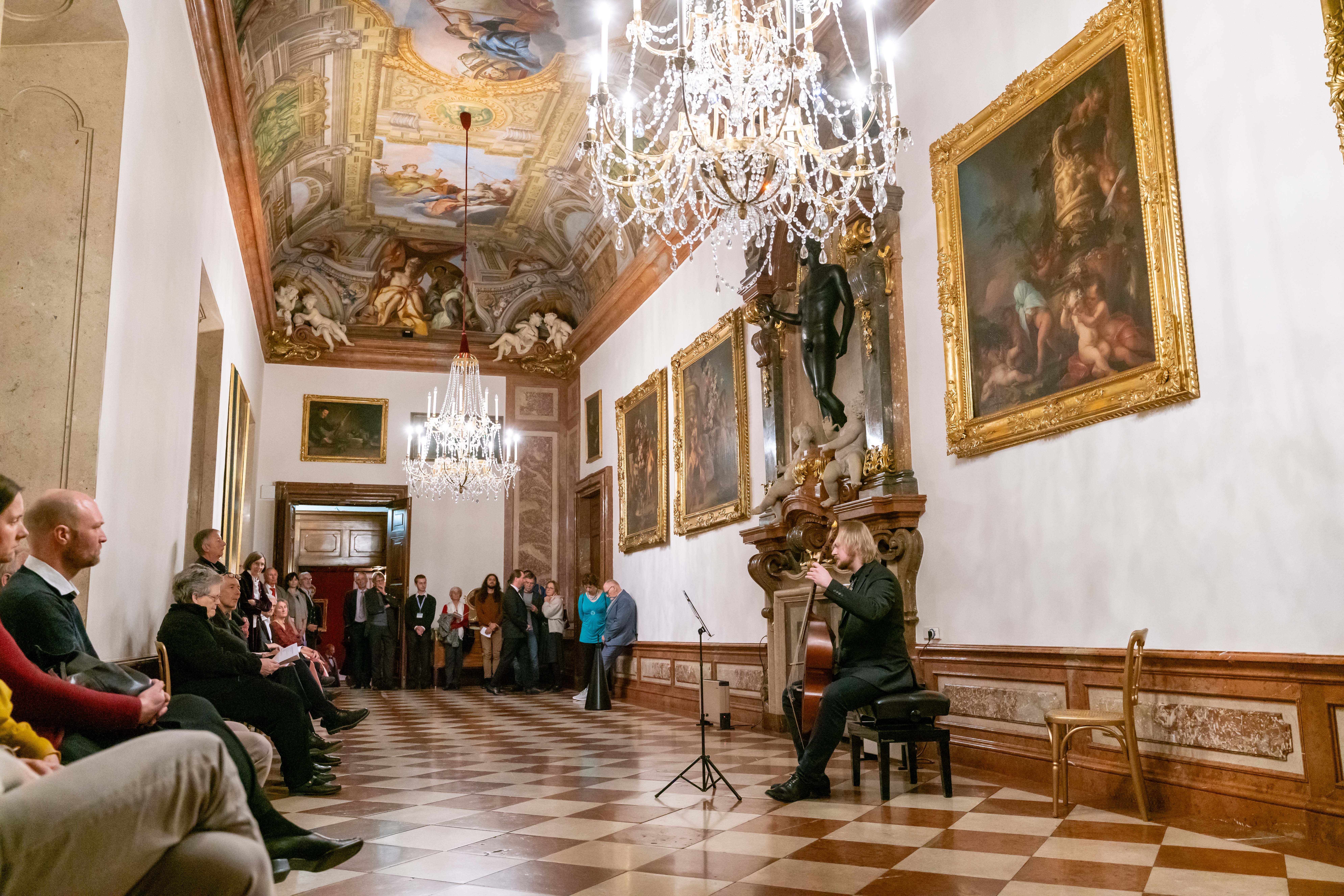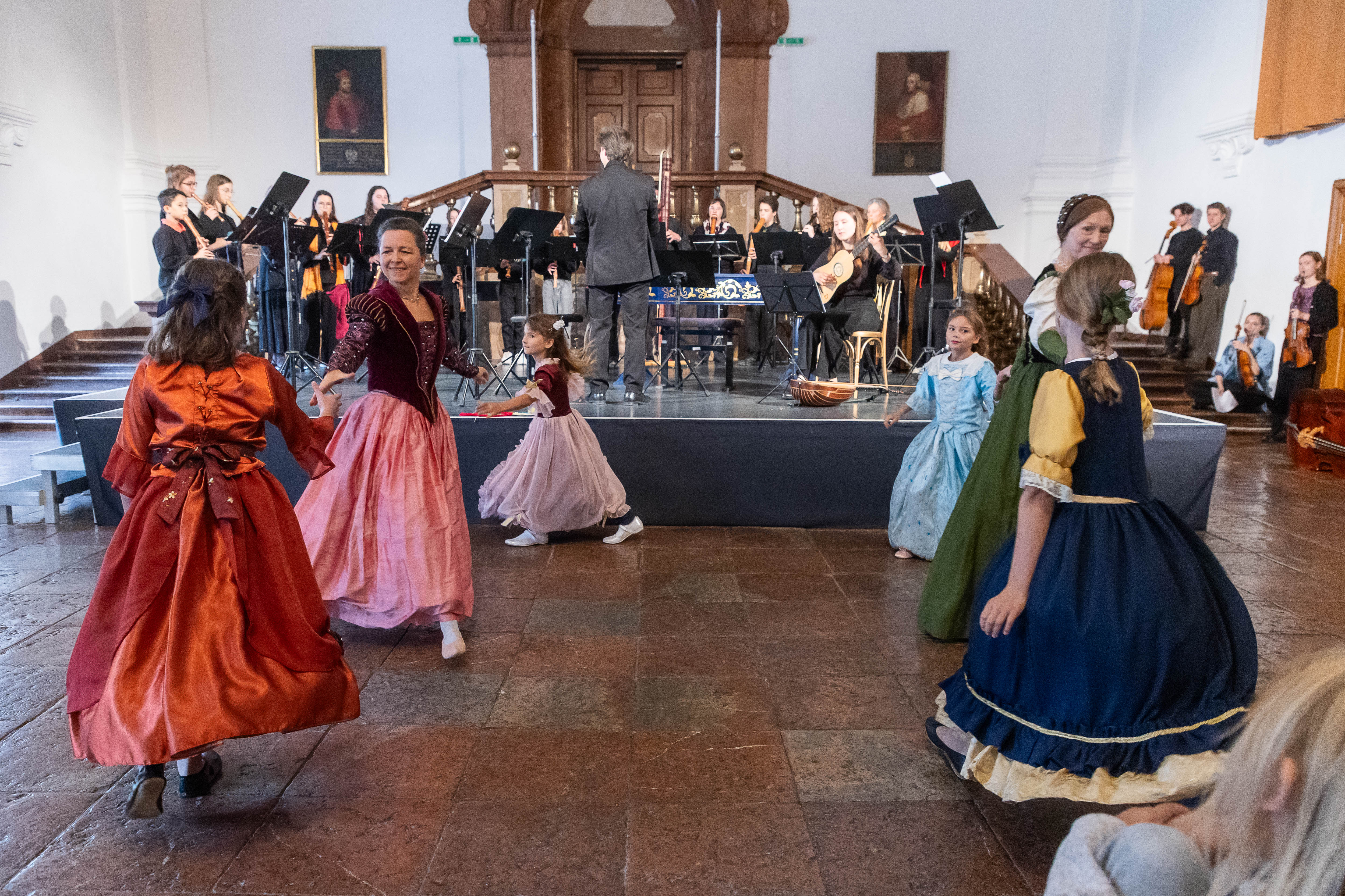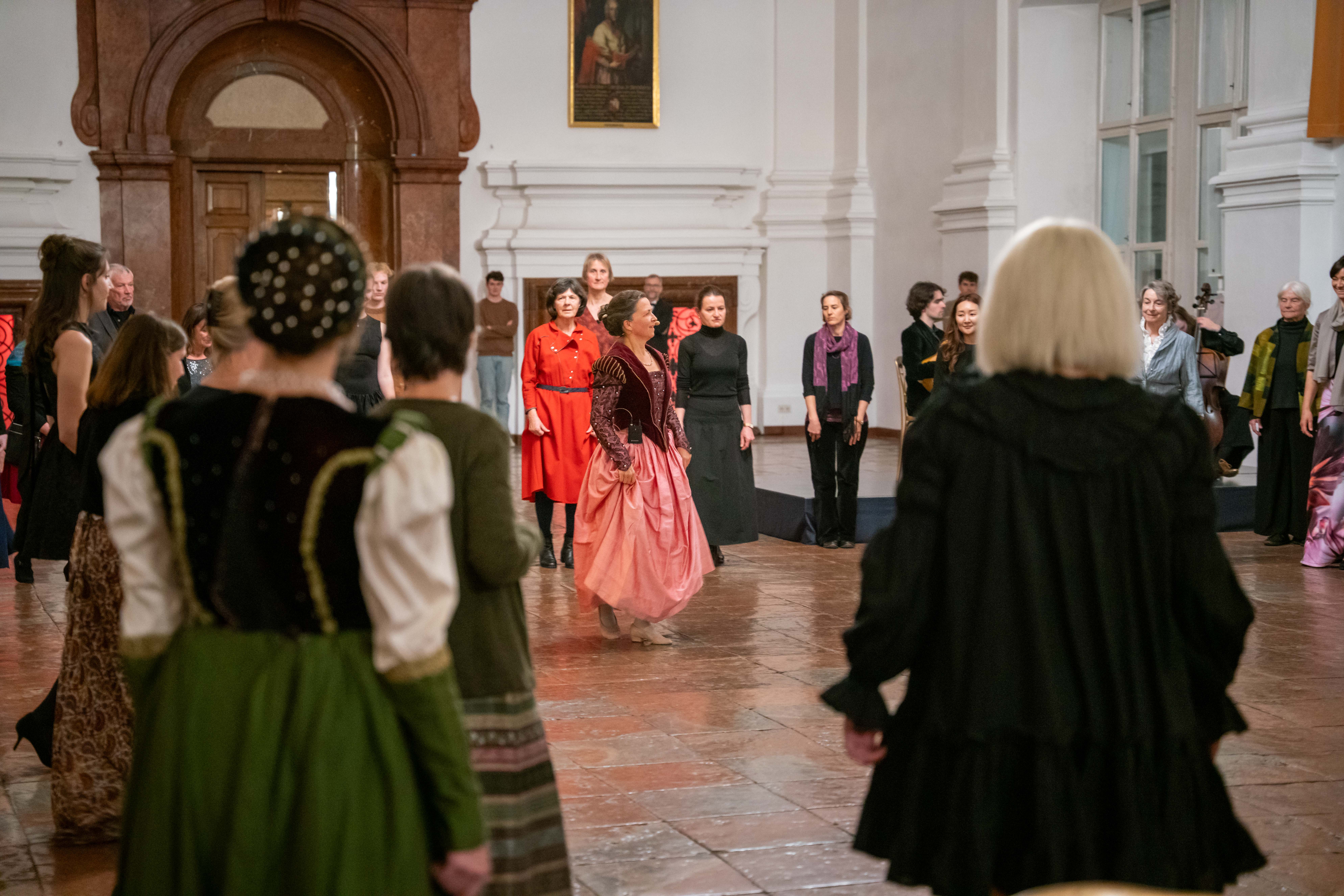 Zwischen dem dritten und vierten Akt von L’Orfeo öffnete sich das DomQuartier für eine barocke Flanage: Besucherinnen und Besucher bewegten sich durch Prunkräume, lauschten Kammerprogrammen in wechselnden Sälen, tanzten historische Tänze und probierten Spiele des 17., 18. und 19. Jahrhunderts.