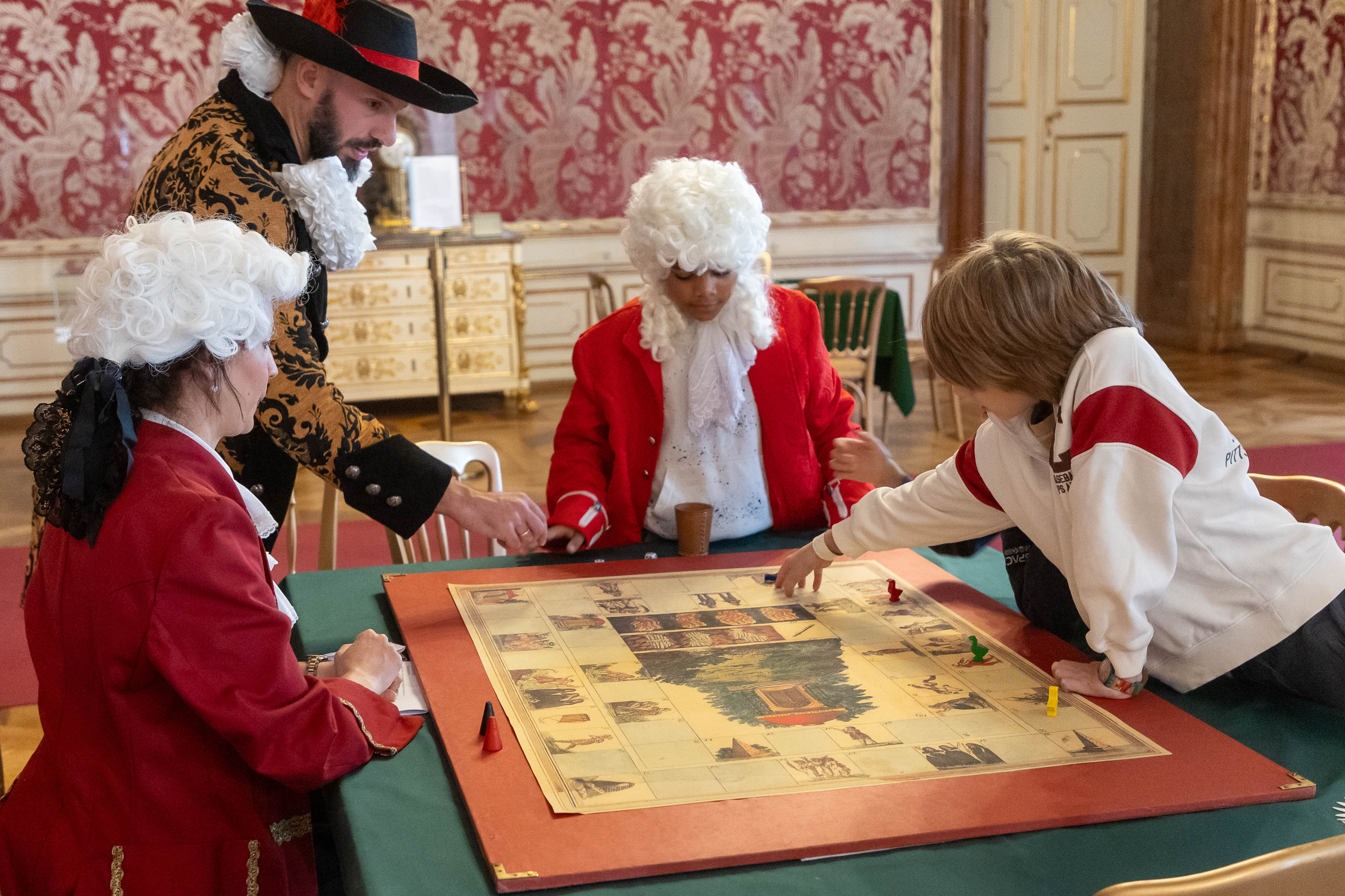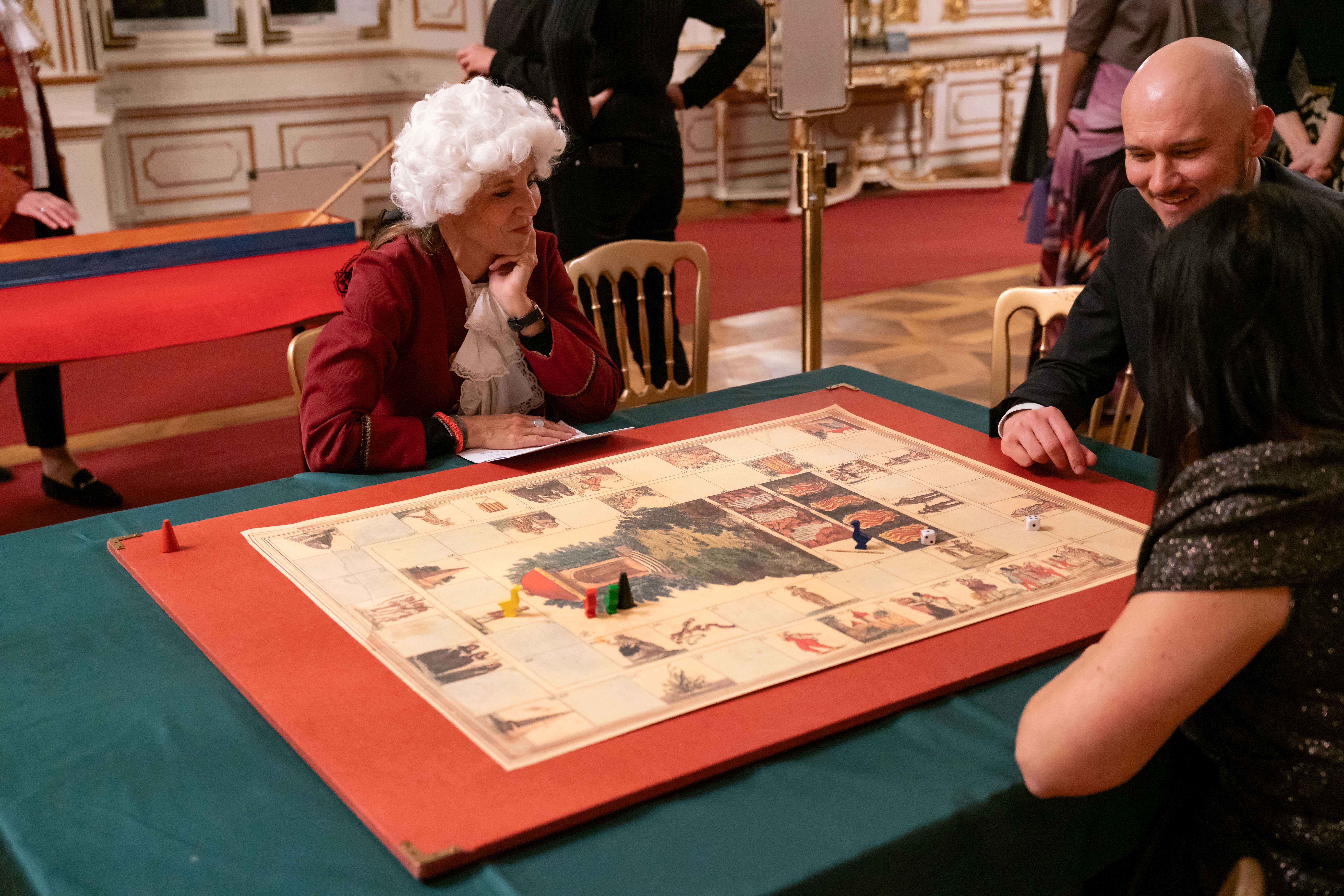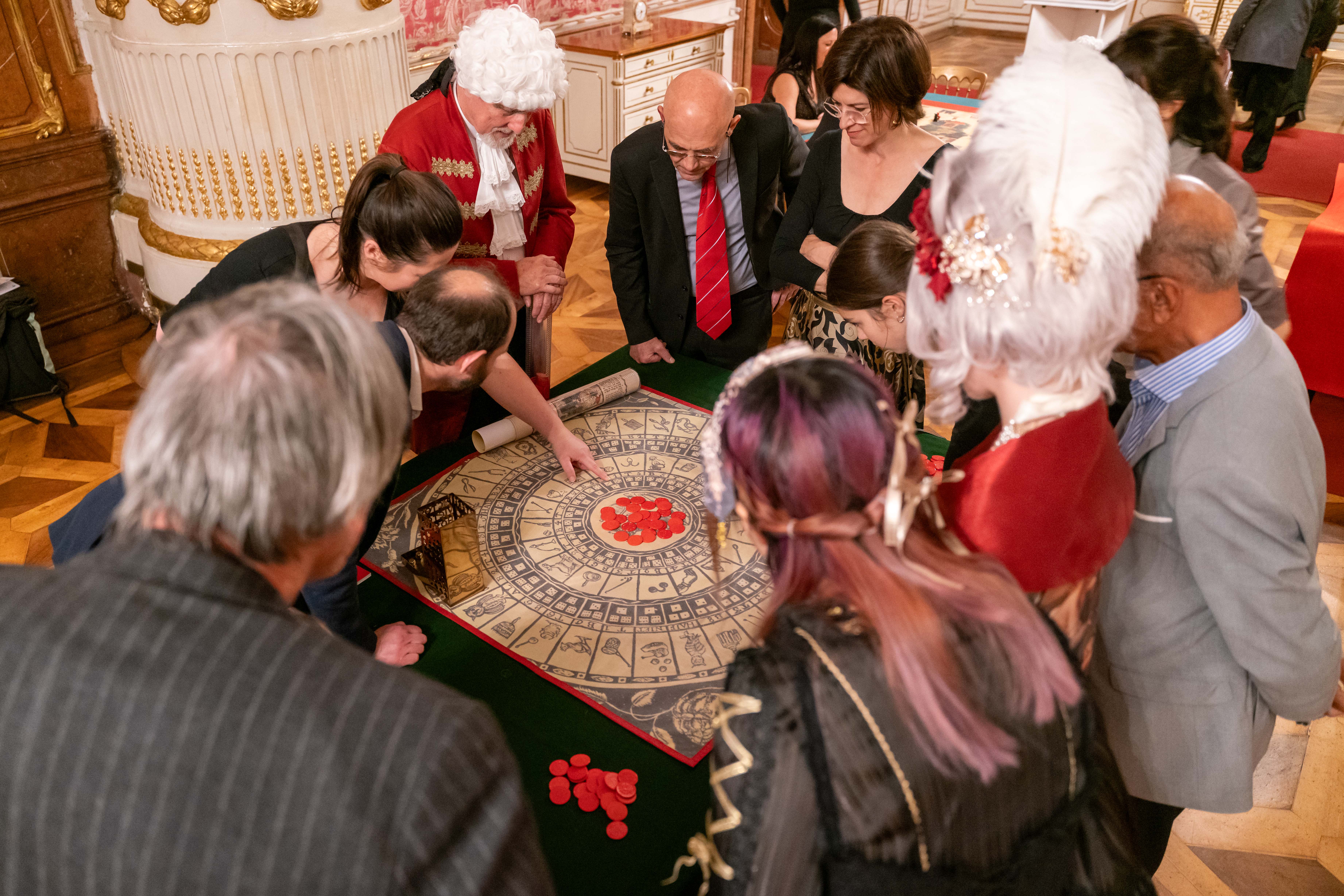 Historische Gesellschaftsspiele wurden in Weißem Saal, Thronsaal und Schlafzimmer als sinnlich-haptische Erlebnisstationen präsentiert: Neben der Möglichkeit, ausgewählte Reprints selbst auszuprobieren – vom Eulenspiel mit drei Würfeln und Lotto- oder Pochspiele über die „Blinde Kuh“ bis zur Tischkegelbahn nach einem Modell um 1800 – vermittelten Vitrinen mit Originalen aus der Sammlung des Instituts für Spielforschung (Universität Mozarteum Salzburg) den historischen Kontext. Zu sehen waren Stiche, handkolorierte Kartenblätter und Spielbretter aus dem 17. und 18. Jahrhundert, darunter das seltene Zauberflötenspiel von 1793, eine Gänsespiel-Variante mit Bühnenbild- und Kostümstichen der Leipziger Aufführung. Begleittexte und kurze fachliche Erläuterungen des Teams um Institutsleiter Rainer Buland machten Herstellungsweisen, Regelsysteme und die damalige Spielkultur anschaulich – so wurde Spielkultur als lebendiges, greifbares Kulturerbe erfahrbar.