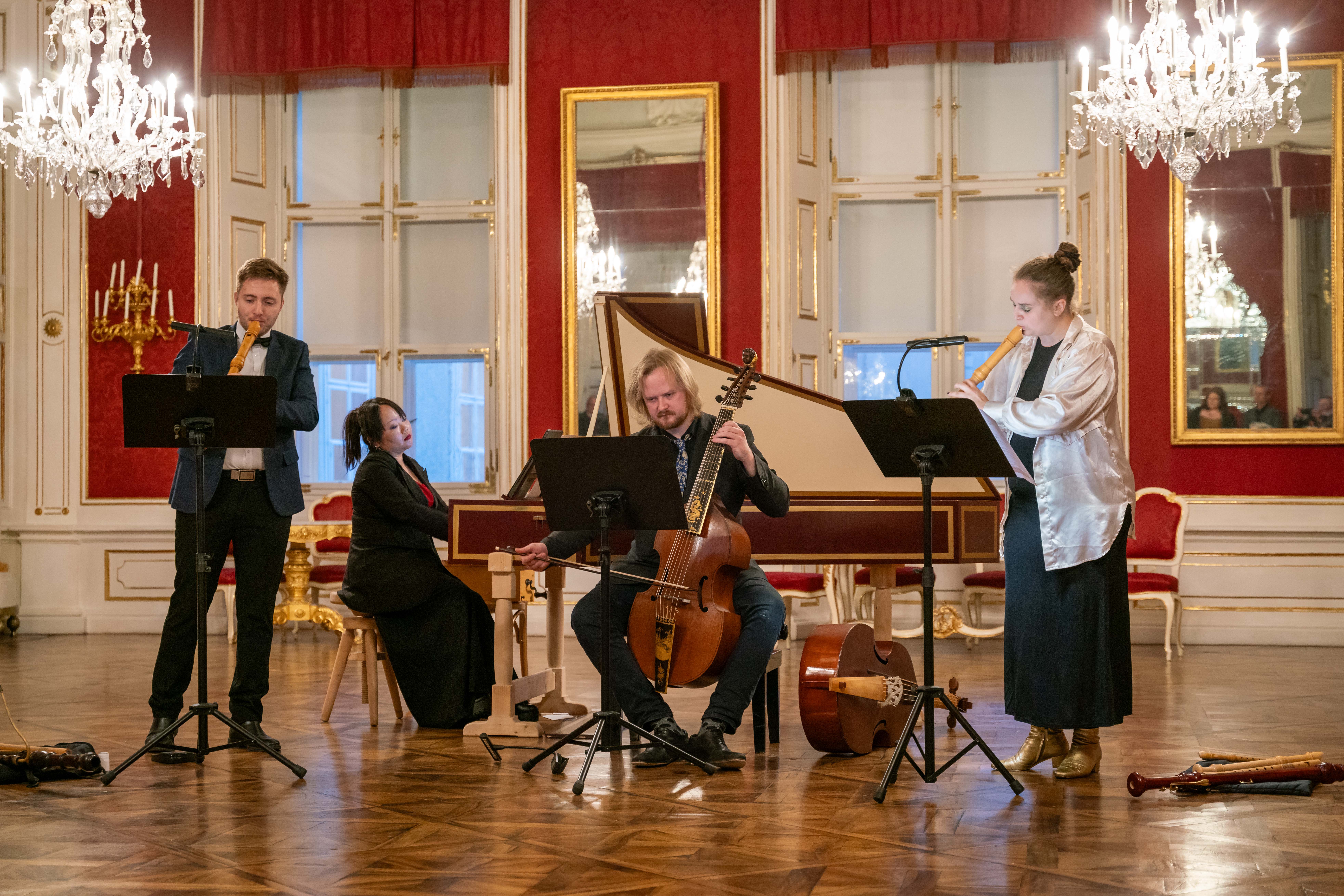 Ein Höhepunkt der Intermezzi war das Programm „Chiaroscuro … von Schatten und Licht“ des Ensembles tone:scape (Konferenzzimmer). Mit Werken von Mainerio, Merula, Falconieri, Matteis und Finger schlug das junge Quartett elegante Schneisen zwischen strahlendem Glanz und melancholischer Tiefe.