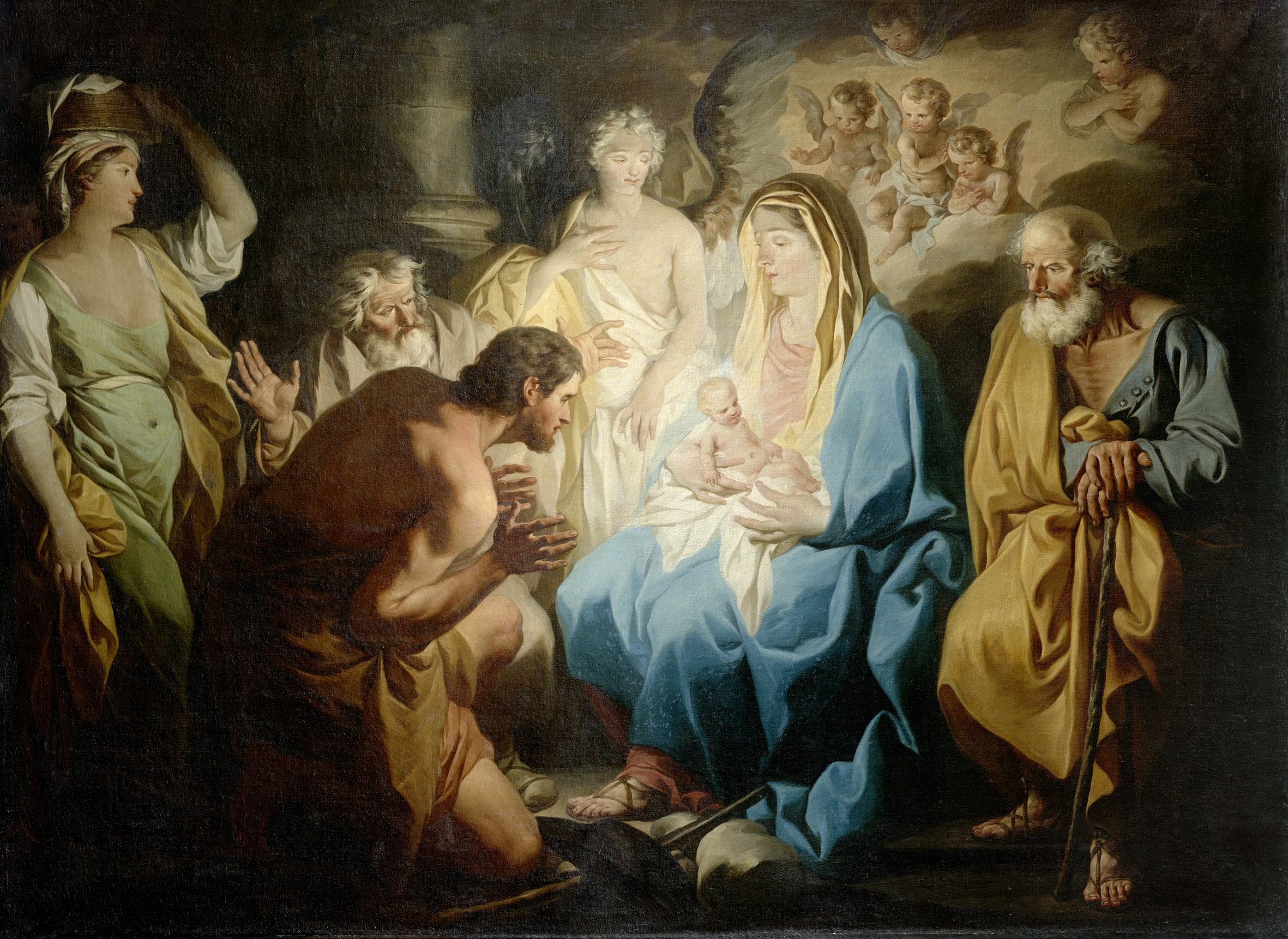 Die "Anbetung der Hirten" und ihr Gegenstück "Anbetung der Heiligen Drei Könige "werden dem Frühwerk Subleyras’ zugerechnet und um 1716 datiert. Der Künstler wuchs in Uzès auf, wo er vermutlich vom Vater ausgebildet wurde, und lebte um 1716 in Carcassone, bevor er ab 1717 eine Ausbildung bei Antoine Rivalz in Toulouse absolvierte, um ungefähr 1720–22 nach Uzès zurückzukehren. "Und sie kamen eilend und fanden beide, Maria und Joseph, dazu das Kind in der Krippe liegen." (Lk 2, 16) Bei Subleyras hält Maria den neugeborenen Jesusknaben in einem weißen Tuch auf ihrem Schoß. Ein Engel und Joseph flankieren sie. Hinter ihnen beobachten Engel auf Wolken das Geschehen. Das von Jesus ausgehende Licht erhellt die Nachtdarstellung, wodurch der Rücken des jungen, niederknienden Hirten im Dunklen liegt. Er führt als Rücken- oder Repoussoir-Figur ins Bildgeschehen hinein. Seine Gestik wie auch die des älteren Hirten und die Kopfhaltung der jungen Magd verraten ihre Ergriffenheit.