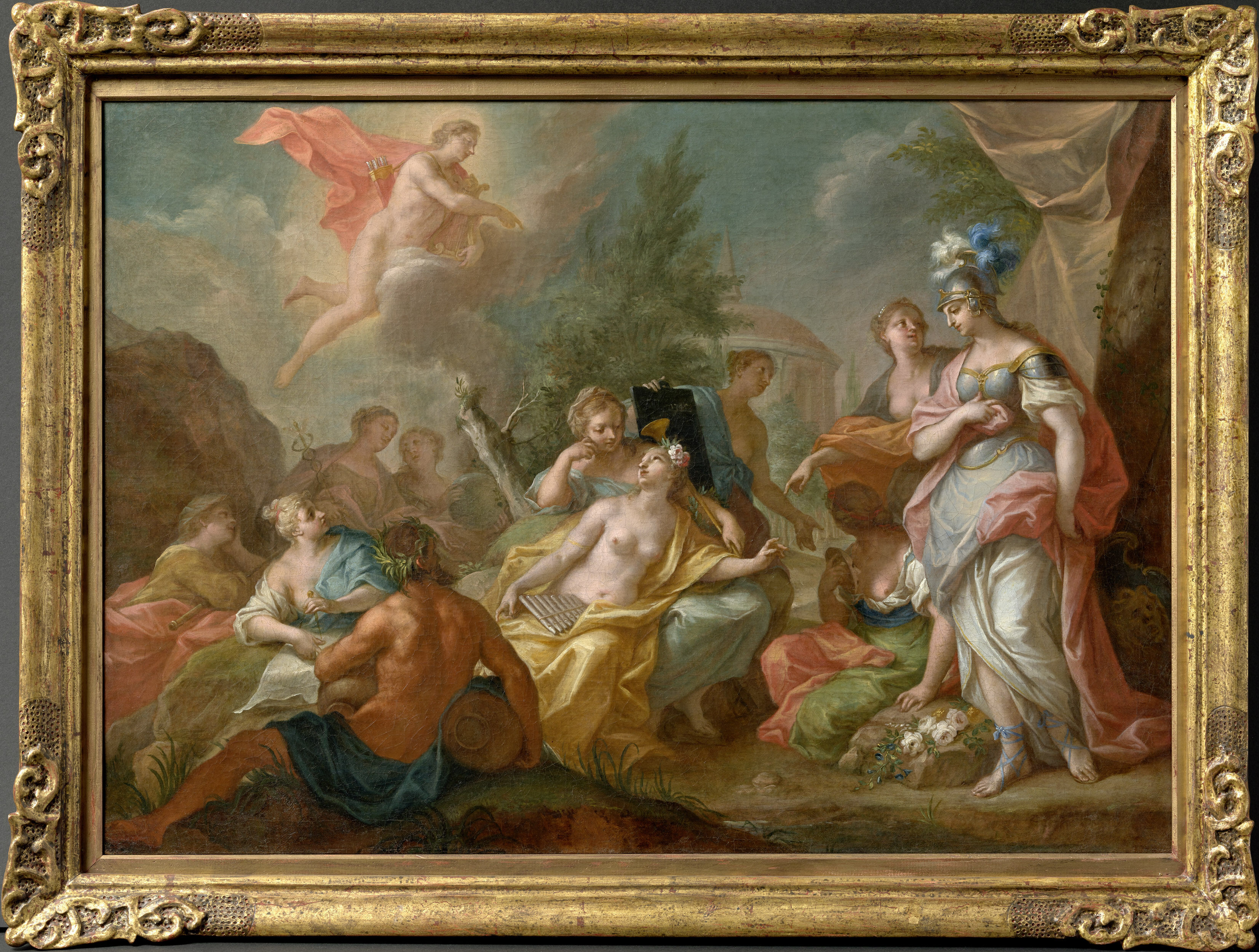 Über der gesamten Szene schwebt Apollo, der Gott des Lichtes und der Schönheit sowie der Musik, Dichtung und Weissagung. Seine Eigenschaften machen ihn zum Anführer der Musen. Wie im Gemälde ist er oft nackt dargestellt, mit Lyra, Pfeilköcher und spärlichem Umhang. Sein Aussehen zieht sich wie ein roter Faden durch die Epochen der Kunst: meist jugendlich, schön von Statur und körperbetont.