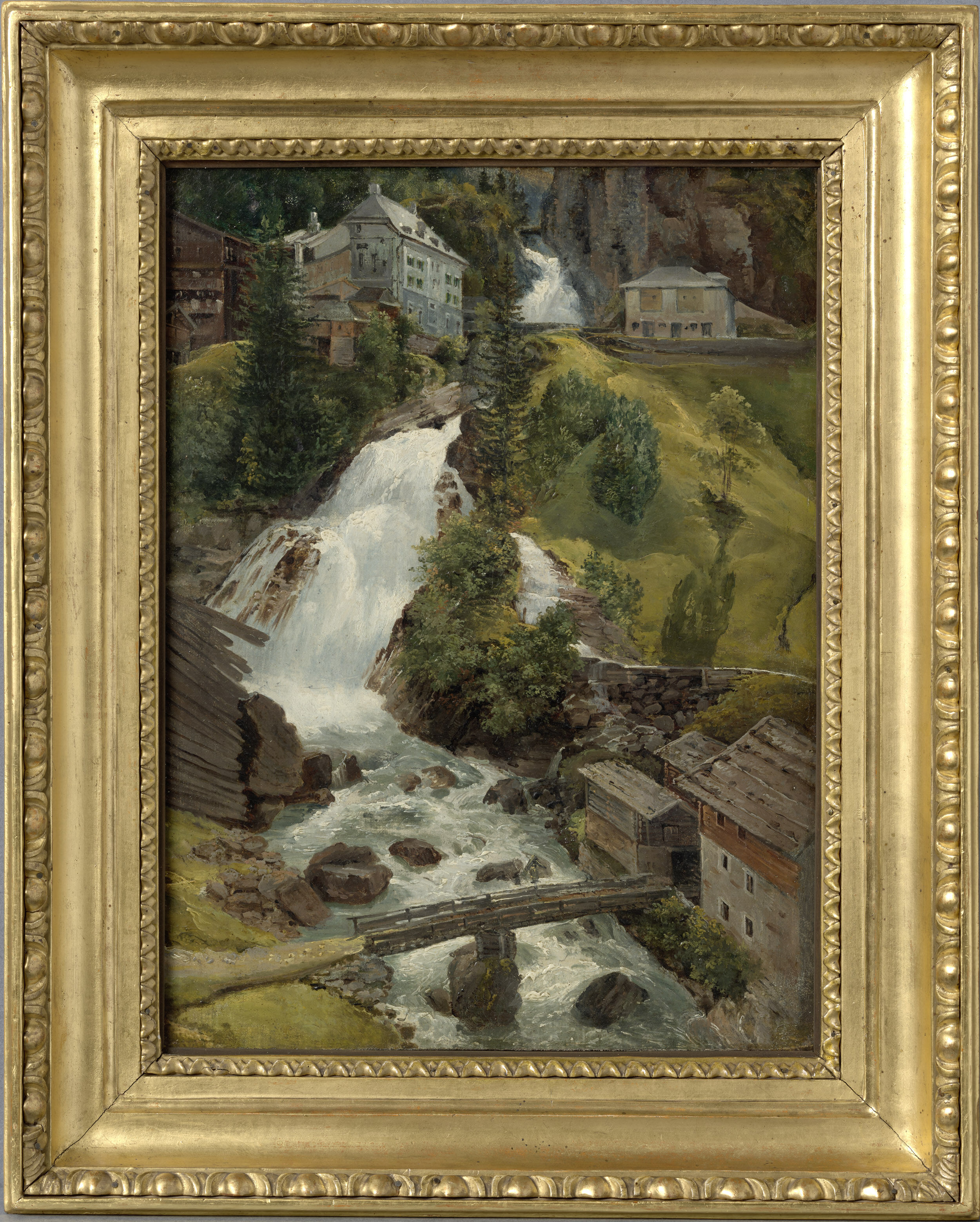 Im knapp gewählten Bildausschnitt von "Bad Gastein mit Wasserfall" ist die herabstürzende, gischtende Gasteiner Ache die Hauptakteurin. Zwischen Gasthof Straubinger und Wasserfall ist der 1825 errichtete mehrstöckige Steinbau Straubinger sichtbar.
