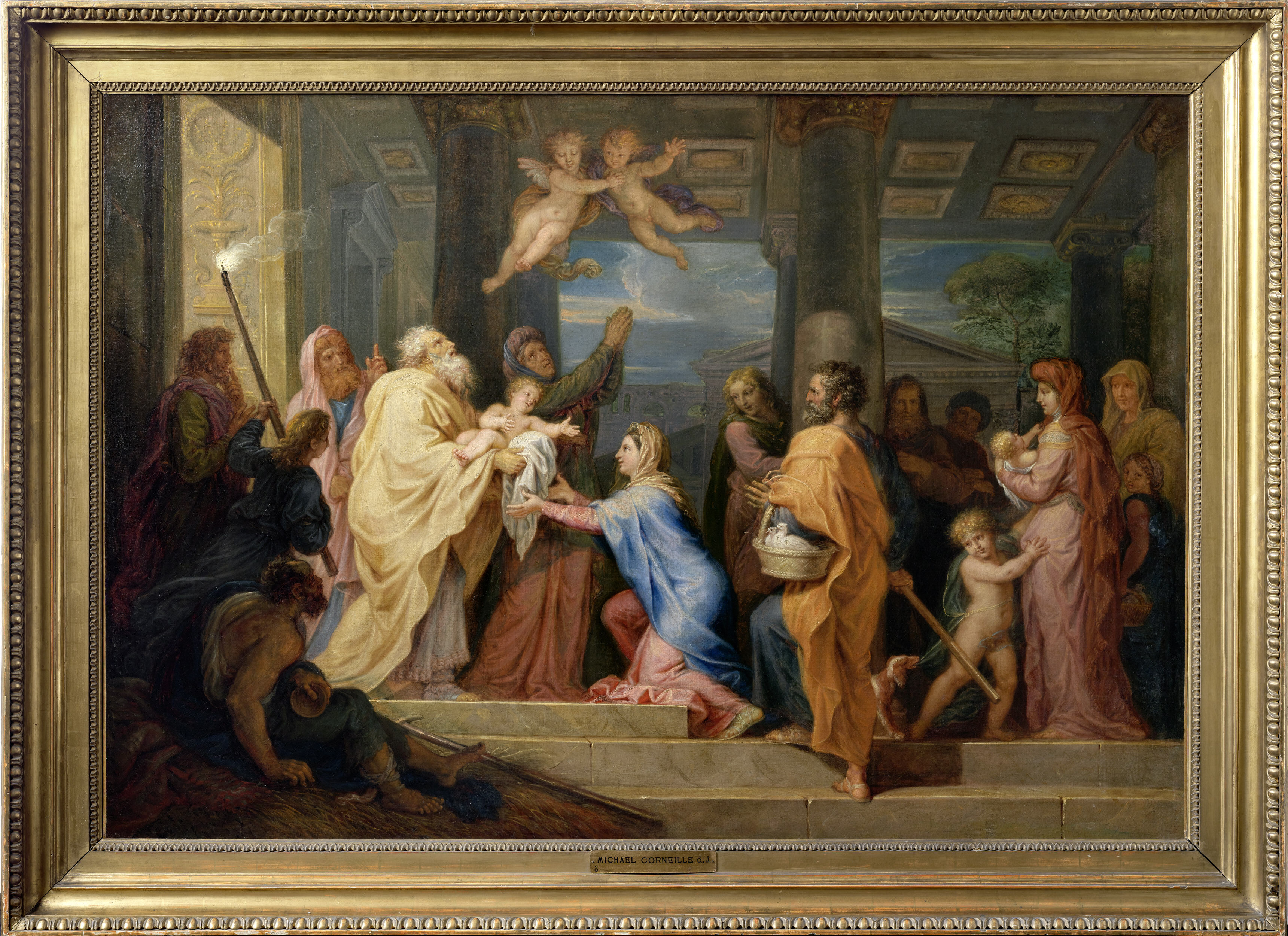 Zur "Darbringung Christi" haben sich mehrere Studien erhalten. Sie variieren durch die Form der Säulen, die Anzahl wie die Körperhaltung der Figuren oder durch einen bogenförmigen Abschluss. Vierzig Tage nach der Geburt bringen Maria und Joseph ihren erstgeborenen Sohn dem Herrn im Tempel in Jerusalem dar. Im Gemälde übergibt Maria Jesus an Simeon, dem der Heilige Geist prophezeit hatte, dass er nicht sterben werde, bevor er den Sohn des Herrn gesehen habe. Hinter ihr steigt Joseph die Stufen zum Tempel empor und trägt einen Korb mit zwei Turteltauben, dem Reinigungsopfer einer armen Frau. Simeon und die hinter ihm stehende Prophetin Hanna wenden ihre Blicke nach oben zu Gott, um ihn zu preisen. (Lk 2, 22–39) In den Schattenzonen verfolgen Beobachter das Geschehen. Die Staffelung der unterschiedlichen Figurengruppen erzeugt räumliche Tiefe. Die von der mittleren Rückenfigur gehaltene Fackel erhellt die Episode im von Säulen getragenen Tempel.
