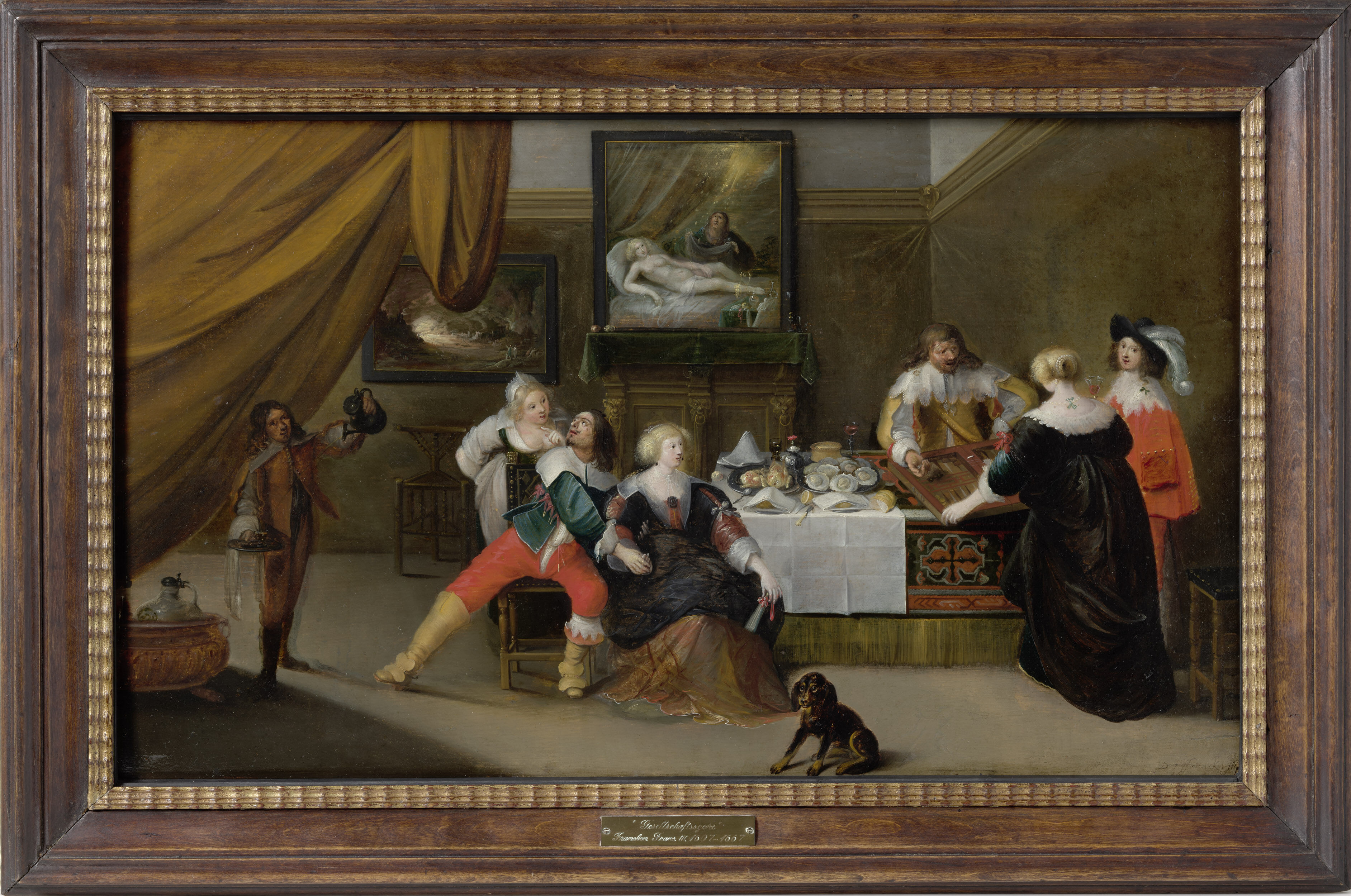 Frans III. zeigt eine an einer reich gedeckten Tafel versammelte Gesellschaft. Gut gekleidet in sanft schimmernden Stoffen, zarten Spitzen und erlesenem Schmuck hat sich die Schar zusammengefunden. An der rechten Tischseite vertreibt sich die Dreiergruppe mit dem Trick-Track- Spiel am Backgammonbrett die Zeit. Brathähnchen, Brot und Pastete sind auf der mit Tischteppich und weißem Tischtuch versehenen Tafel angerichtet. Tiefdekolletiert beugt sich die junge Magd über den vor ihr sitzenden Herrn. Noch umfasst er mit beiden Händen die neben ihm sitzende Dame. Gestik und Bewegung des Jünglings verraten den wahren Anlass der Zusammenkunft, den der Künstler durch die Integration von zwei Gemälden als Raumausstattung seines Werks verdeutlicht.