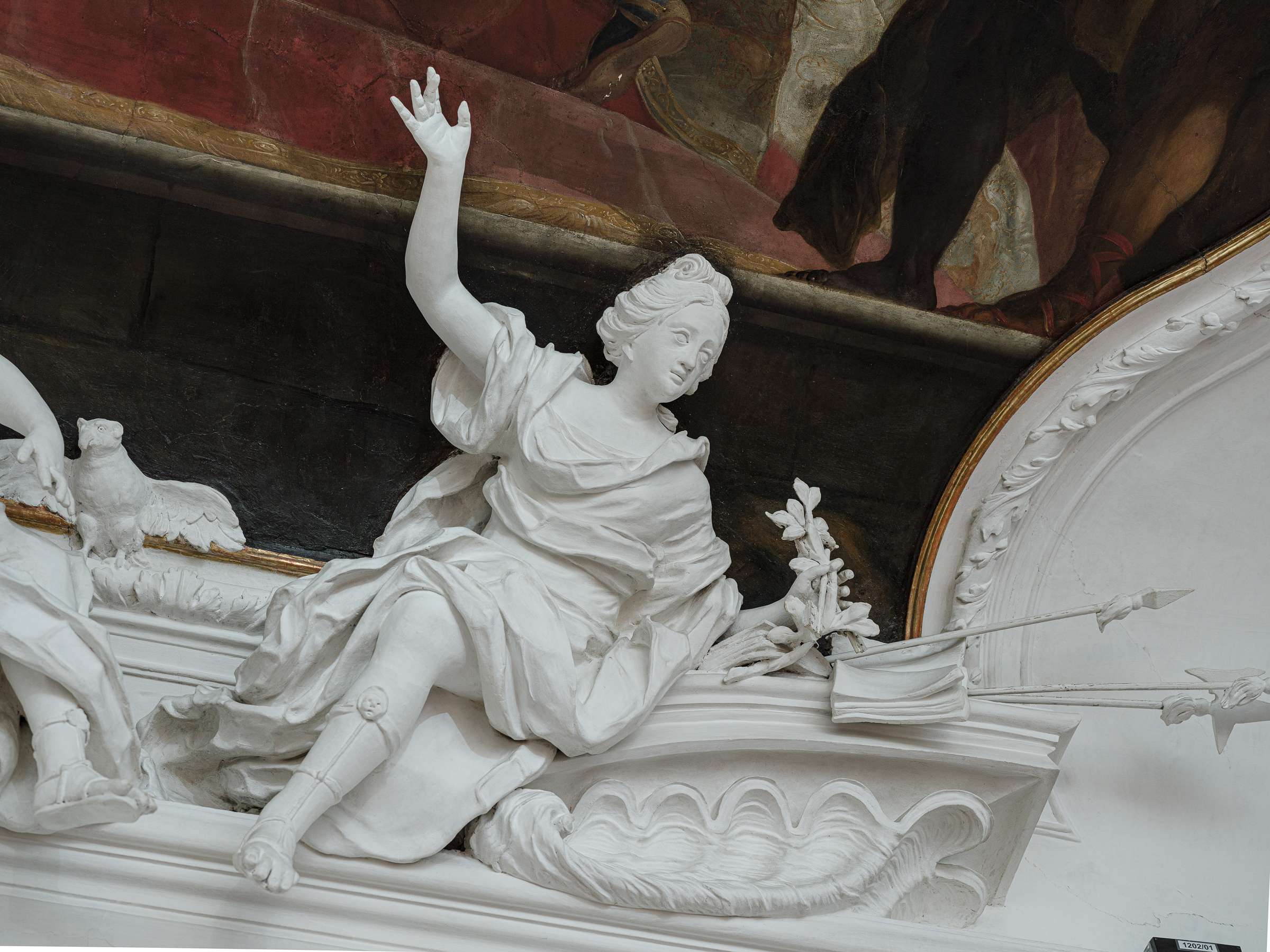 Die aus Stuck geformte Figur gehört zu den unterhalb der Decke angebrachten Skulpturen: Es sind vier Paare von Frauen und kleinen Kindern, Putti genannt, die bestimmte Inhalte verkörpern, die auch in den Deckenbildern geschildert werden. Diese Frau ist mit einem Palmzweig, einem Buch und Waffen ausgestattet und zeigt mit erhobenem Arm auf das Gemälde über ihr. Sie kann als Sinnbild der Verbindung von Weisheit und Macht angesehen werden. Geschaffen wurden die Figuren von dem Wiener Hof-Stuckateur Alberto Camesina, der um 1710 von Fürsterzbischof Franz Anton Harrach mit der Stuckausstattung der Decke beauftragt wurde. Camesina schuf auch die typischen barocken Stuck-Ornamente und die Reliefdarstellungen. Der Stuckateur erhielt für seine Werke in der Residenz ein höheres Honorar als die beiden Maler der Deckenbilder, Johann Michael Rottmayr und Martino Altomonte.