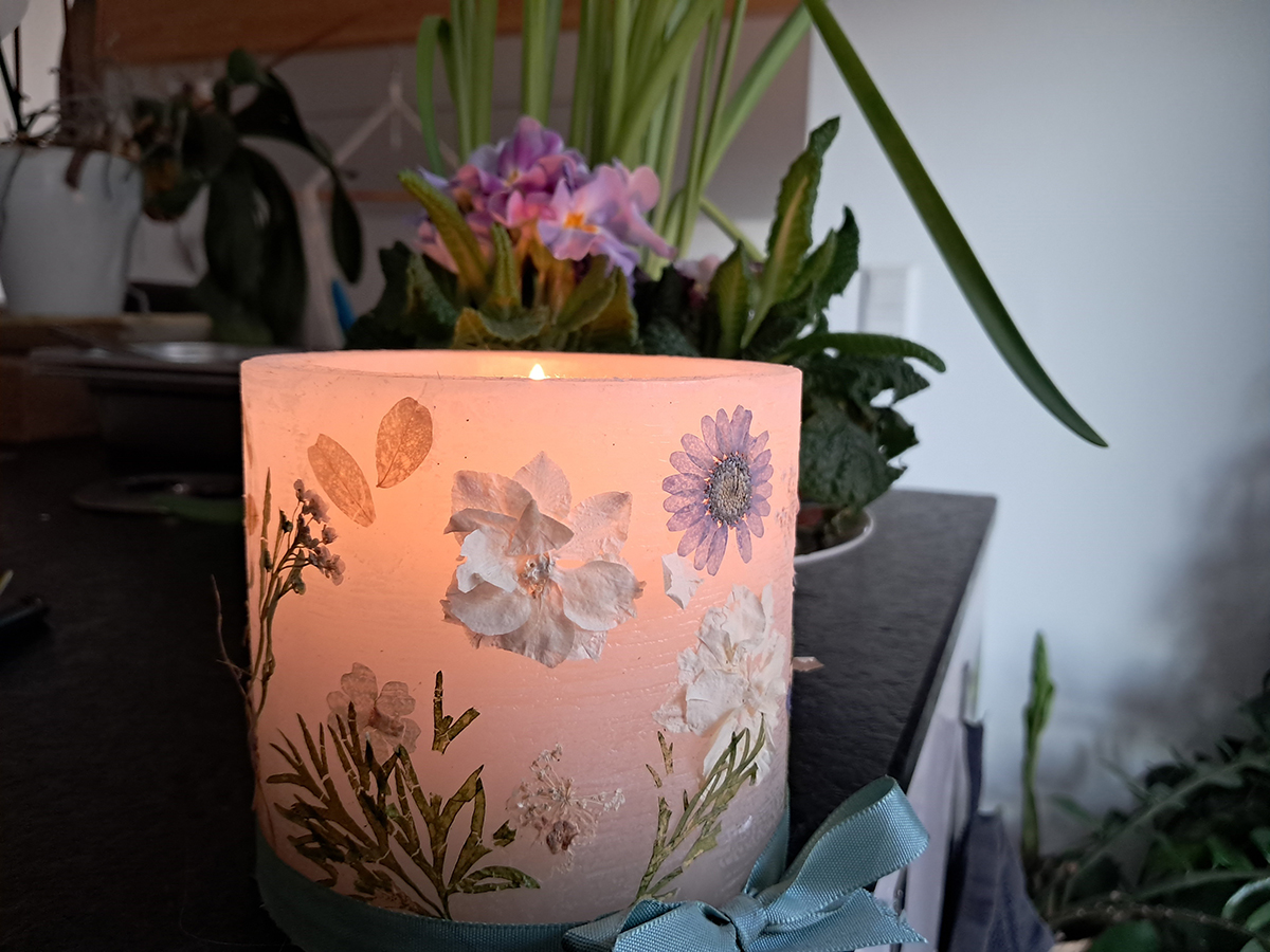 Mit edlen gepressten Blüten wird auf Wachs gearbeitet und dabei entsteht eine individuelle, stilvolle und besonders dekorative Kerze.